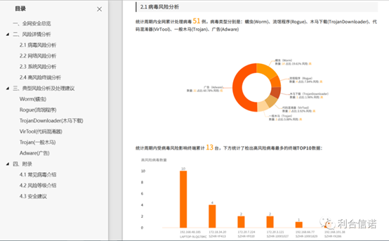 支持一鍵對當(dāng)前中心進行安全狀況分析并導(dǎo)出報告。提供了全網(wǎng)概況一覽圖、風(fēng)險詳情分析等。并且針對當(dāng)前中心提供安全建議和常見風(fēng)險等級、病毒介紹等。